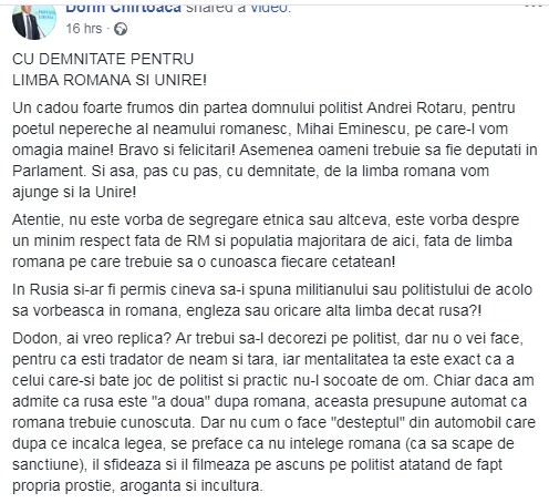 Ieri, un șofer a somat un polițist pe nume Andrei Rotaru să-i vorbească în limba rusă, însă polițistul a refuzat. Momentul filmat de către șofer a stârnit discuții aprinse pe rețelele de socializare. Unii au lăudat polițistul, în timp ce alții nu au fost de acord cu atitudinea acestuia.
