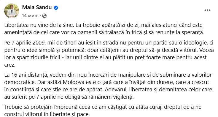 La 16 ani distanță, vedem din nou încercări de manipulare și de subminare a valorilor democratice. Dar astăzi Moldova este o țară care a învățat din durere, care a crescut în conștiință și care știe ce are de apărat. Adevărul, libertatea și demnitatea celor care au suferit pe 7 aprilie ne obligă să rămânem vigilenți.