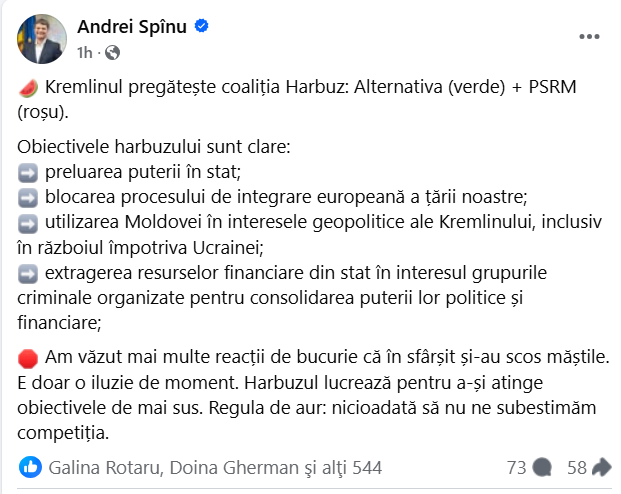 Am văzut mai multe reacții de bucurie că în sfârșit și-au scos măștile. E doar o iluzie de moment. Harbuzul lucrează pentru a-și atinge obiectivele de mai sus. Regula de aur: niciodată să nu ne subestimăm competiția”, a scris Andrei Spînu.