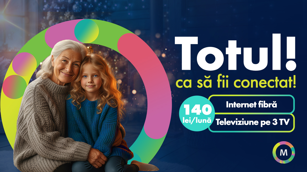Internet fibră + TV pe 3 ecrane de la 140 lei/lună. Telefonie mobilă cu beneficii nelimitate de la 80 lei/lună. Iar cadourile — SmartTV, tabletă, smartphone sau PlayStation — doar 1 leu.