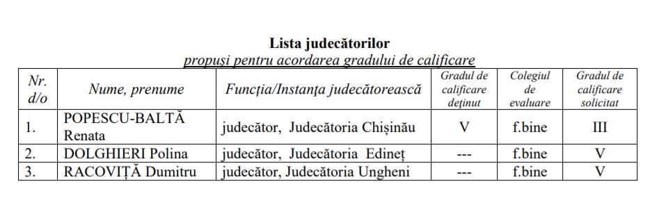 (update 9:55) Cu 8 voturi pro și 4 contra, CSM a decis conferirea gradului de calificare 4 judecătoarei Popescu Baltă Renata, de la judecător, Judecătoria Chișinău, și cu câte 12 voturi pro și 0 împotrivă – gradului de calificare 5 judecătorilor Dolghieri Polina, Judecătoria Edineț și Racoviță Dumitru, Judecătoria Ungheni.