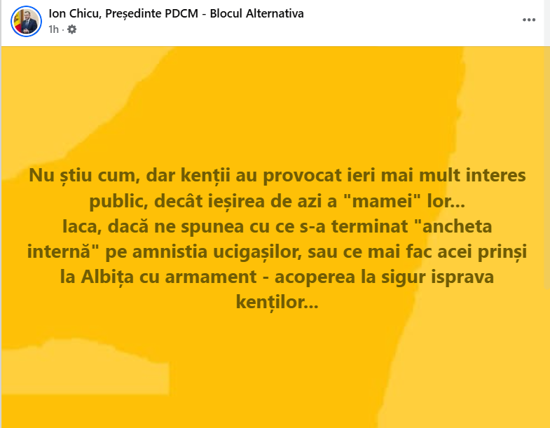 Iaca, dacă ne spunea cu ce s-a terminat „ancheta internă" pe amnistia ucigașilor, sau ce mai fac acei prinși la Albița cu armament - acoperea la sigur isprava kenților…”, a scris Chicu.