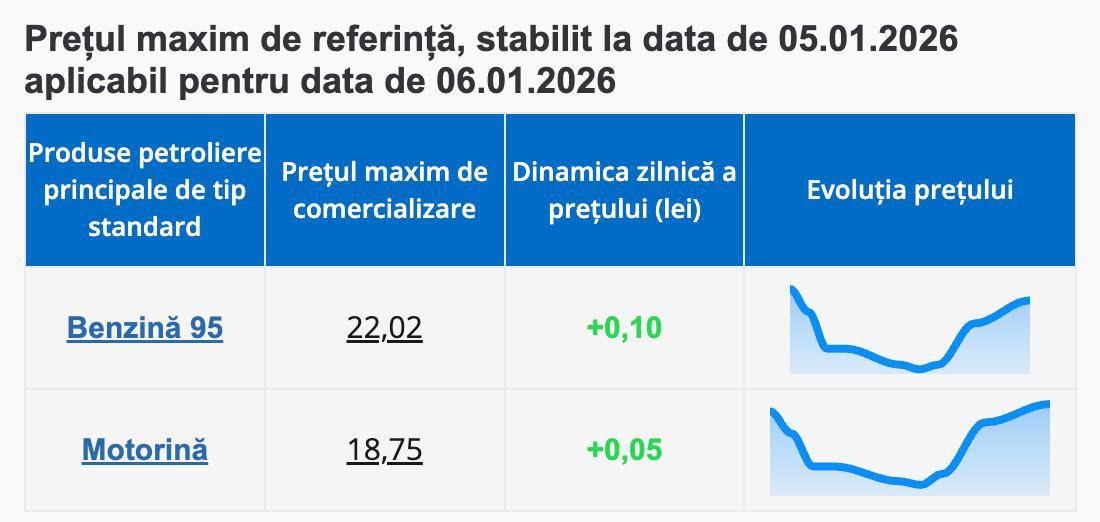 Agenția Națională pentru Reglementare în Energetică (ANRE) anunță pentru mâine, 6 ianuarie, prețuri mai mari la carburanți. Astfel, pentru un litru de benzină șoferii vor plăti cu 10 bani mai mult, iar pentru cel de motorină - cu 5 bănuți.