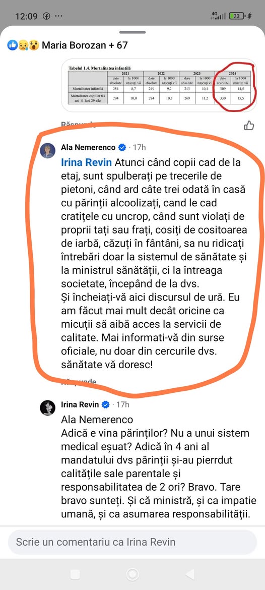 „Totuși, eu vreau să scot în evidență acest comentariu al fostei – deja, din fericire - ministrei Sănătății, doamna Ala Nemerenco, care ieri m-a blocat pentru că i-am pus întrebări incomode despre practica dublare a mortalității infantile exact în cei patru ani ai mandatului dumneaei.