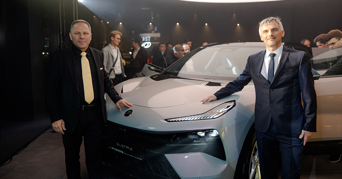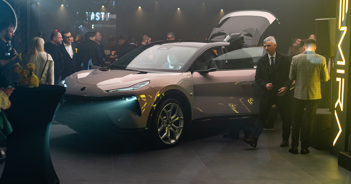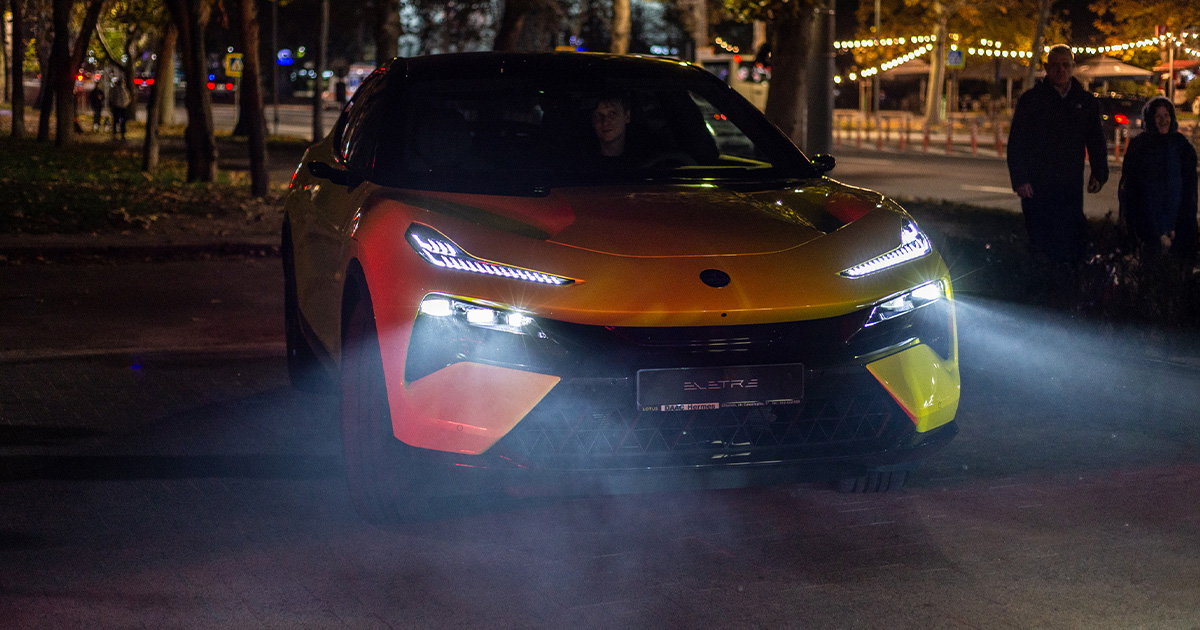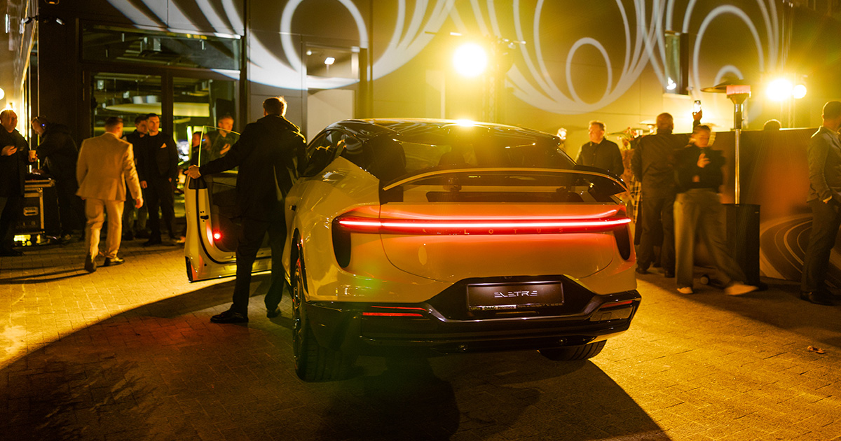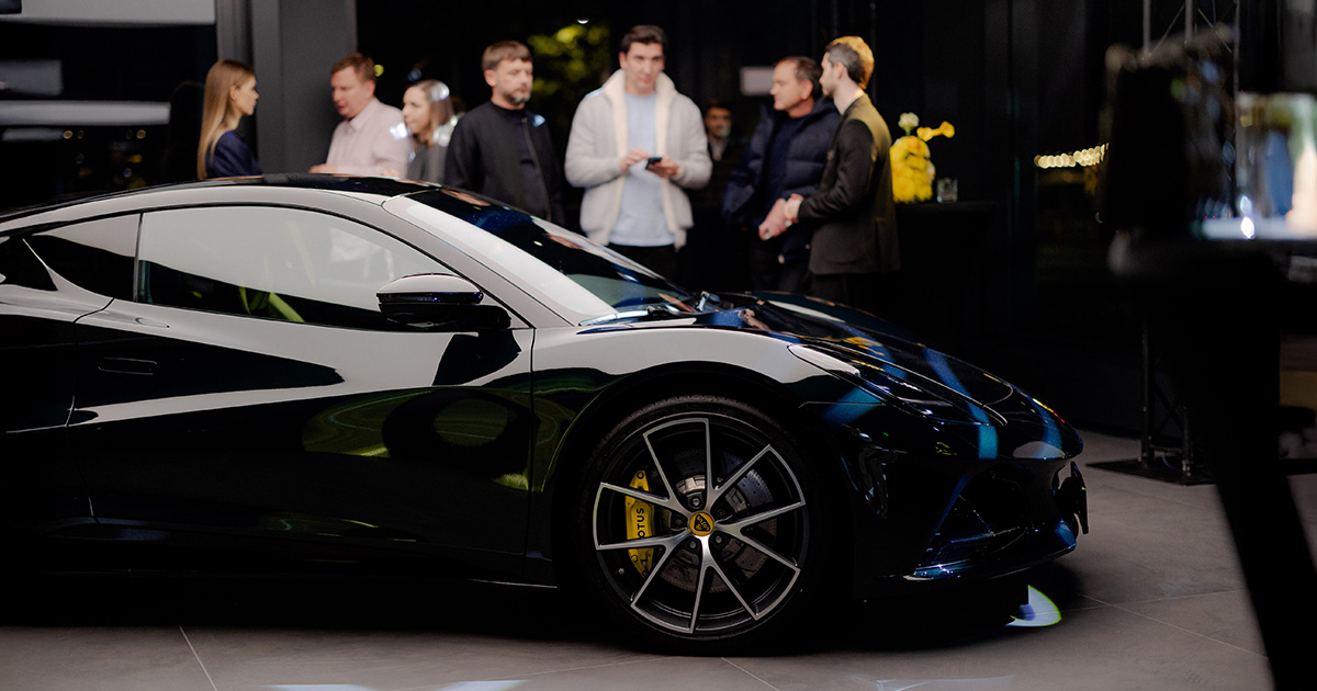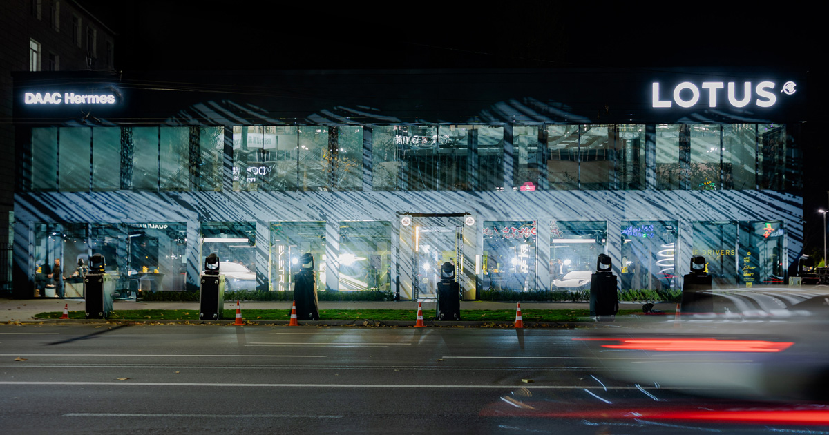 Și iată — lumină. Spectacol cu laser. Pe platforma din fața salonului apar unul după altul LOTUS Emeya și LOTUS Eletre. În liniște, cu efect. Ele nu se anunță – pur și simplu apar. În interiorul salonului, oaspeții erau deja așteptați de un LOTUS Emira negru și de un altul, nu mai puțin spectaculos, Eletre. Formatul este ideal: fără grabă, doar contact – cu mașinile, cu spațiul, cu filosofia mărcii.
