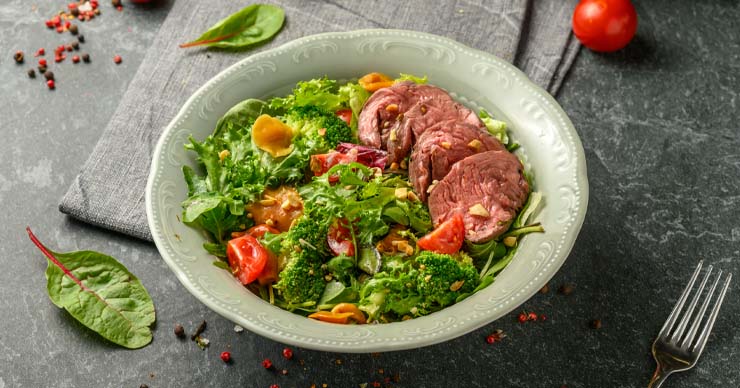 Salată cu roast beef, roșii, brocoli și ghebe, cu dressing de parmezan și arahide – O explozie de arome și texturi. Frunzele proaspete de salată iceberg, împreună cu bucățile fragede de roast beef crează este o experiență gourmet în fiecare furculiță.