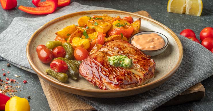 Steak de porc cu cartofi copți, rozmarin și ardei marinat – pentru iubitorii de arome robuste, steak-ul de porc, fraged și suculent, vine însoțit de cartofi copți cu rozmarin și ardei marinat, alături de cornișon crocant. Sosul special îți va trezi papilele gustative și va completa perfect această combinație de toamnă.