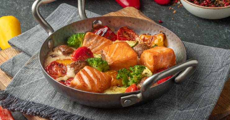 Somon copt cu dovlecel, ciuperci, ardei dulce, roșii cherry și brocoli – Un preparat de pește sublim, unde somonul copt la perfecțiune se îmbină cu prospețimea dovlecelului și ciupercilor, dulceața ardeiului și a roșiilor cherry, alături de brocoli crocant. Friscă fină adaugă o notă cremoasă ce te va cuceri.