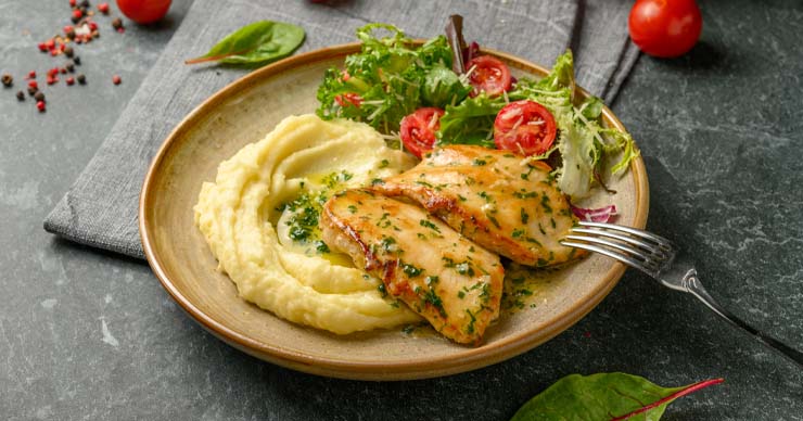 Steak de pui cu piureu de cartofi, salată iceberg și dressing cu ghimbir și parmezan – Un preparat consistent, dar fin, steak-ul de pui fraged se așază pe un pat de piureu de cartofi catifelat, înconjurat de salată iceberg crocantă și roșii suculente. Totul este desăvârșit de un dressing ușor condimentat cu ghimbir și parmezan.