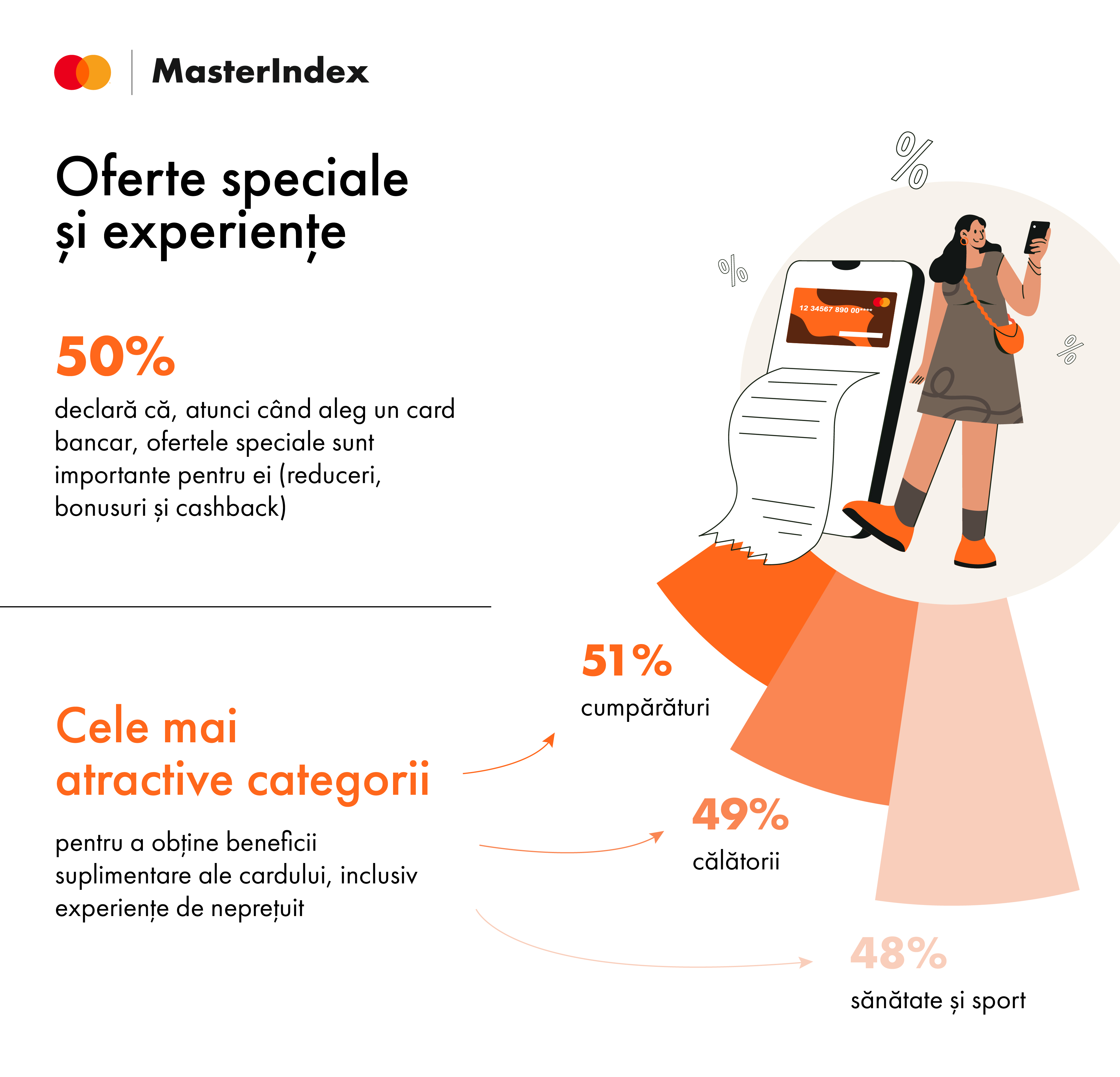 Jumătate dintre locuitorii Moldovei au menționat că, atunci când aleg un card bancar, pentru ei este important să poată beneficia de oferte speciale, inclusiv reduceri, bonusuri și cashback. Fiecare al treilea utilizator a confirmat, de asemenea, că este important să aibă acces la experiențe speciale. Printre cele mai interesante categorii pentru a obține avantaje suplimentare cu cardul, respondenții au menționat: cumpărăturile (51%), călătoriile (49%), sănătatea și sportul (48%).