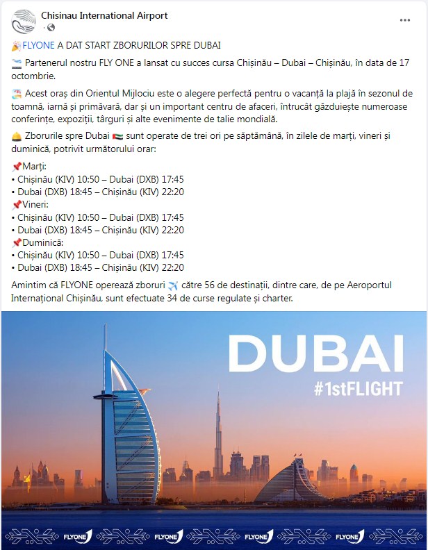 - Dubai (DXB) 18:45 – Chișinău (KIV) 22:20