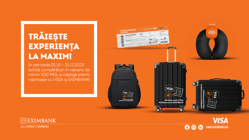 Începând cu 1 octombrie și până pe 31 decembrie 2023, EXIMBANK și VISA au pregătit o campanie promoțională unde ai șansa de a câștiga premii utile pentru călătorii! Tot ce trebuie să faci este să achiziționezi orice produs sau serviciu în valoare minimă de 500 MDL la comercianții din Republica Moldova (prin intermediul POS-terminalelor și online), folosind cardul VISA de la EXIMBANK. Prin acest gest simplu, te califici automat pentru a participa la o serie de extrageri, unde poți câștiga premii utile pentru călătorii.