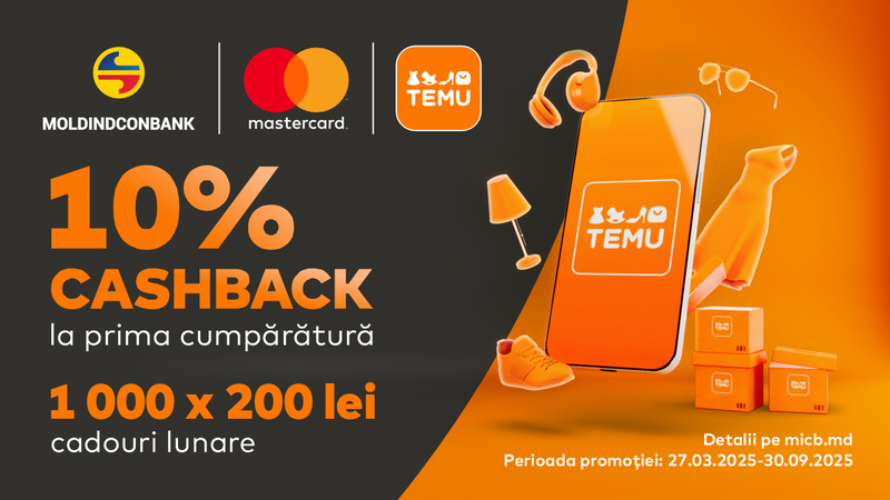 Promoția se desfășoară în perioada 27 martie – 30 septembrie 2025. Mai multe detalii despre campania ”Cumpărături cu beneficii pe Temu cu cardul Mastercard de la Moldindconbank” sunt disponibile în Regulament.