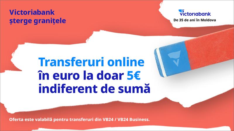 În anul în care marchează 35 de ani de activitate, Victoriabank lansează o ofertă unică: transferuri în euro efectuate online la un tarif de doar 5 EUR, indiferent de sumă sau destinație. Această ofertă este disponibilă atât pentru persoane fizice, cât și pentru companii, oferindu-le clienților posibilitatea de a transfera bani sigur și la cel mai mic cost de pe piață. În plus, IMM-urile care devin clienți Victoriabank în perioada campaniei și aleg pachetul Nelimitat / CPAG beneficiază timp de 3 luni de transferuri online în euro cu ZERO costuri.