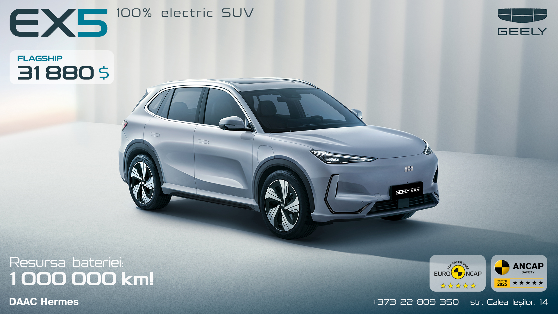 GEELY EX5 vă așteaptă deja în centrele auto GEELY Moldova din Chișinău, Bălți și Cahul.