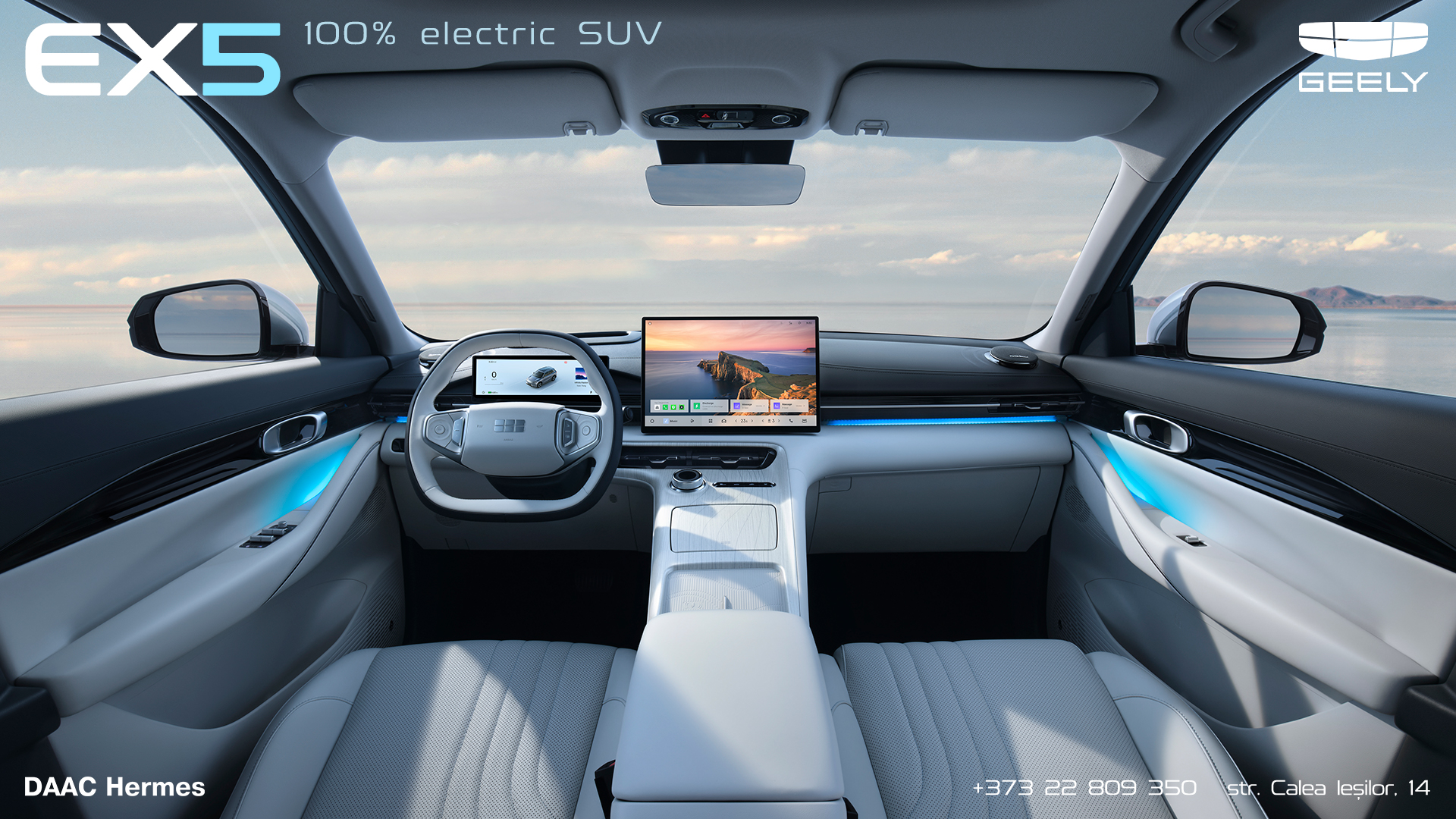 GEELY EX5 vă așteaptă deja în centrele auto GEELY Moldova din Chișinău, Bălți și Cahul. Descoperiți tehnologiile viitorului, astăzi!