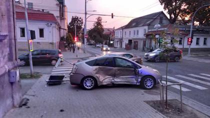 (foto) Două maşini s-au lovit violent în centrul capitalei: Una a fost aruncată pe trotuar, doborând indicatoare