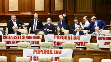 (foto) „Poporul, dat cu capul de asfalt”: Pancarte în sala Parlamentului, în timp ce se examineaza moțiunea împotriva Guvernului Recean