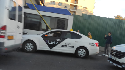 (video) Imaginea serii: Un taximetru, cu parbrizul spart, după ce a fost „împuns de coarnele” unui troleibuz