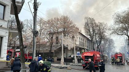 (foto/video) Patru sectoare de luptă cu flăcările la incendiul de la restaurantul din centrul capitalei: Peste 100 de pompieri implicați