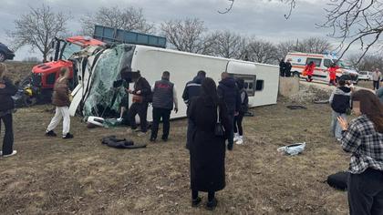 (galerie foto) Un autocar cu pasageri s-a tamponat violent cu un tractor, la Ștefan Vodă și s-a răsturnat