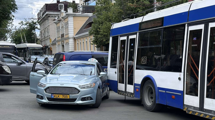 (foto/video) Accident în centrul capitalei: O mașină de taxi și un troleibuz plin cu pasageri s-au lovit la o intersecție