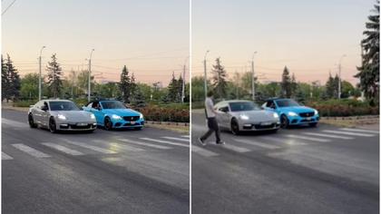 (video) Start de pe zebră: Trei bolizi de lux - Porsche, BMW și Mercedes s-au luat la o întrecere periculoasă în plin trafic, în capitală. Un pieton, la un pas să fie spulberat