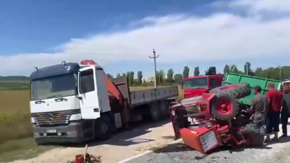 (video) Un tractor s-a răsturnat, după ce a fost lovit de un TIR, la Ratuș: Un șofer, spitalizat