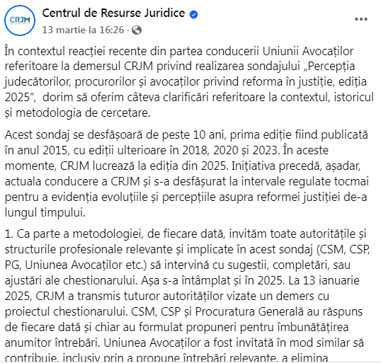 Având în vedere aceste circumstanțe, deși apreciem activitatea mai multor juriști din echipa CRJM, Președintele Uniunii Avocaților nu va da curs solicitării CRJM de a participa la sondajul de opinie privind „Percepția judecătorilor, procurorilor și avocaților privind reforma în justiție, ediția 2025”, realizat de către compania „Magenta Consulting” SRL, la comanda Centrului de Resurse Juridice din Moldova și nu încurajează avocații să completeze chestionarul (https://bit.ly/sistem-judecatoresc) în cadrul acestui sondaj.