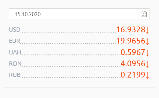 Banca Națională a Moldovei a stabilit pentru astăzi, 15 octombrie 2020, cursul oficial de schimb al monedei europene la 19,96 lei, iar al dolarului - 16,93 de lei.