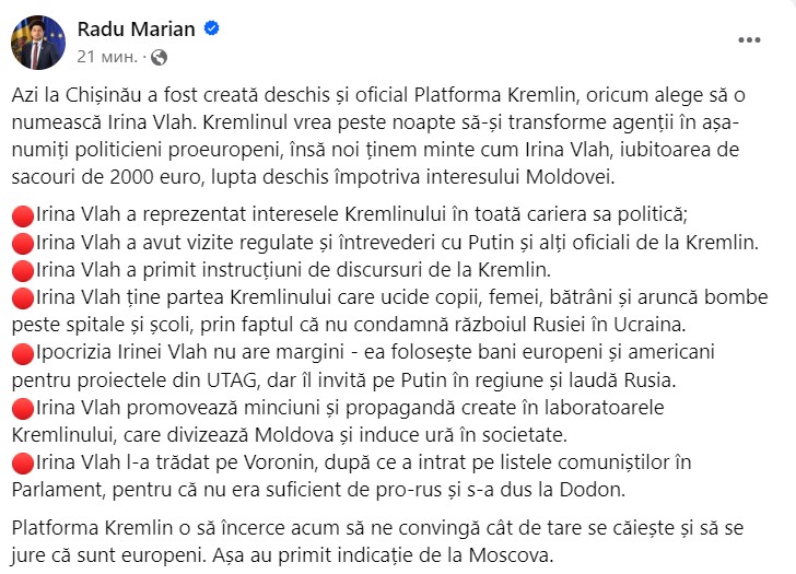 Platforma Kremlin o să încerce acum să ne convingă cât de tare se căiește și să se jure că sunt europeni. Așa au primit indicație de la Moscova”, a scris Radu Marian.