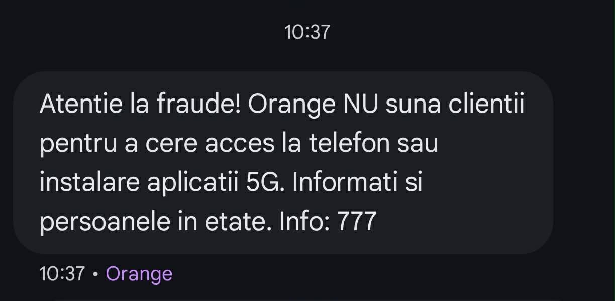 „Atenție la fraude! Orange NU sună clienții pentru a cere acces la telefon sau instalare de aplicații 5G. Informați și persoanele în etate. Info:777”, se menționează în mesajul transmis de companie clienților.