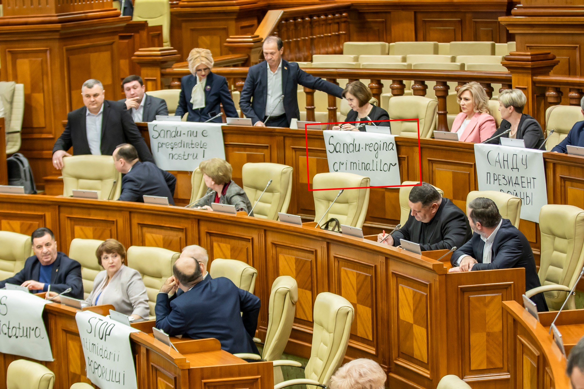 „Deputații Blocului Comuniștilor și Socialiștilor au întâmpinat-o pe președintele Maia Sandu, care a venit în Parlament pentru a rosti un discurs în sprijinul partidului de guvernământ PAS, cu pancarte: „Sandu nu este președinta noastră!”, „Sandu – regina criminalității”, „Sandu – președinta războiului”, „Jos dictatura!””, se arată într-un comunicat al comuniștilor.