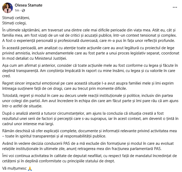 Având în vedere decizia conducerii PAS de a mă exclude din formațiune și modul în care au evoluat relațiile instituționale în ultimele zile, anunț retragerea mea din fracțiunea parlamentară PAS.