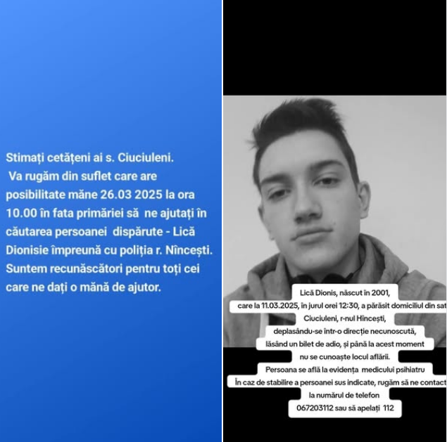 „Stimați cetățeni ai satului Ciuciuleni, vă rog din suflet, cine are posibilitatea să vină astăzi, 26 martie, la ora 10:00 în fața primăriei din localitate pentru a ne ajuta să-l găsim pe Lică Dionisie împreună cu poliția din raionul Hîncești.
