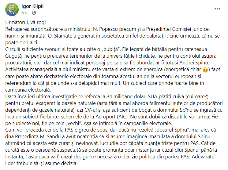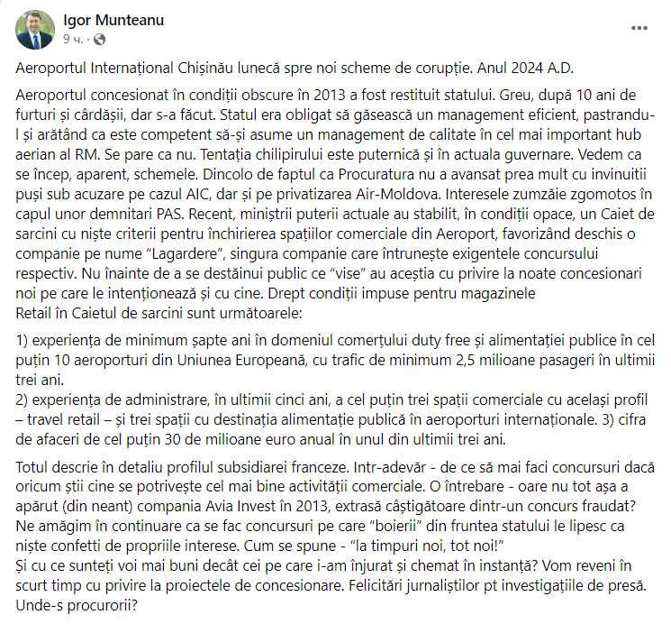 „Aeroportul concesionat în condiții obscure în 2013 a fost restituit statului. Greu, după 10 ani de furturi și cârdășii, dar s-a făcut. Statul era obligat să găsească un management eficient, pastrandu-l și arătând că este competent să-și asume un management de calitate în cel mai important hub aerian al RM. Se pare că nu. Tentația chilipirului este puternică și în actuala guvernare. Vedem că se încep, aparent, schemele. Dincolo de faptul că Procuratura nu a avansat prea mult cu invinuiții puși sub acuzare pe cazul AIC, dar și pe privatizarea Air-Moldova. Interesele zumzăie zgomotos în capul unor demnitari PAS. Recent, miniștrii puterii actuale au stabilit, în condiții opace, un Caiet de sarcini cu niște criterii pentru închirierea spațiilor comerciale din Aeroport, favorizând deschis o companie pe nume „Lagardere”, singura companie care întrunește exigențele concursului respectiv. Nu înainte de a se destăinui public ce „vise” au aceștia cu privire la poate concesionari noi pe care le intenționează și cu cine. Drept condiții impuse pentru magazinele Retail în Caietul de sarcini sunt următoarele: