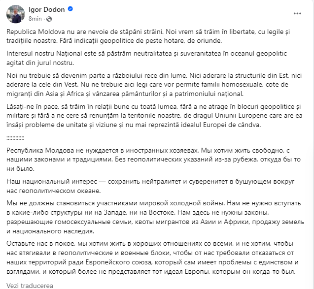 Lăsați-ne în pace, să trăim în relații bune cu toată lumea, fără a ne atrage în blocuri geopolitice și militare și fără a ne cere să renunțăm la teritoriile noastre, de dragul Uniunii Europene care are ea însăși probleme de unitate și viziune și nu mai reprezintă idealul Europei de cândva”, a punctat Igor Dodon.