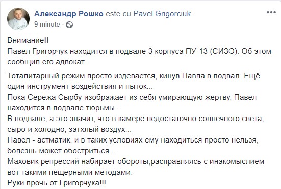 În subsol, ceea ce înseamnă că nu există suficientă lumină solară în cameră, este umedă și rece. Pavel suferă de astm și pur și simplu nu poate fi în astfel de condiții, boala se poate înrăutăți”, a scris juristul Alexandru Roșco pe pagina sa de Facebook.