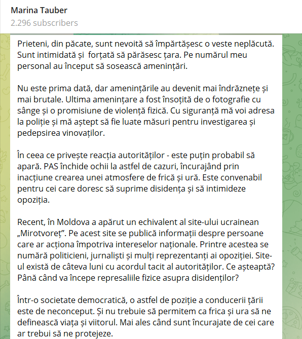 Într-o societate democratică, o astfel de poziție a conducerii țării este de neconceput. Și nu trebuie să permitem ca frica și ura să ne definească viața și viitorul. Mai ales când sunt încurajate de cei care ar trebui să ne protejeze”, a scris Marina Tauber.