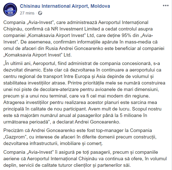 NR Investments Ltd a anunțat, într-o declarație oficială, că renunță cumpărarea cotei de 95% din Avia Invest SRL, compania concesionară a Aeroportului Internațional Chișinău.
