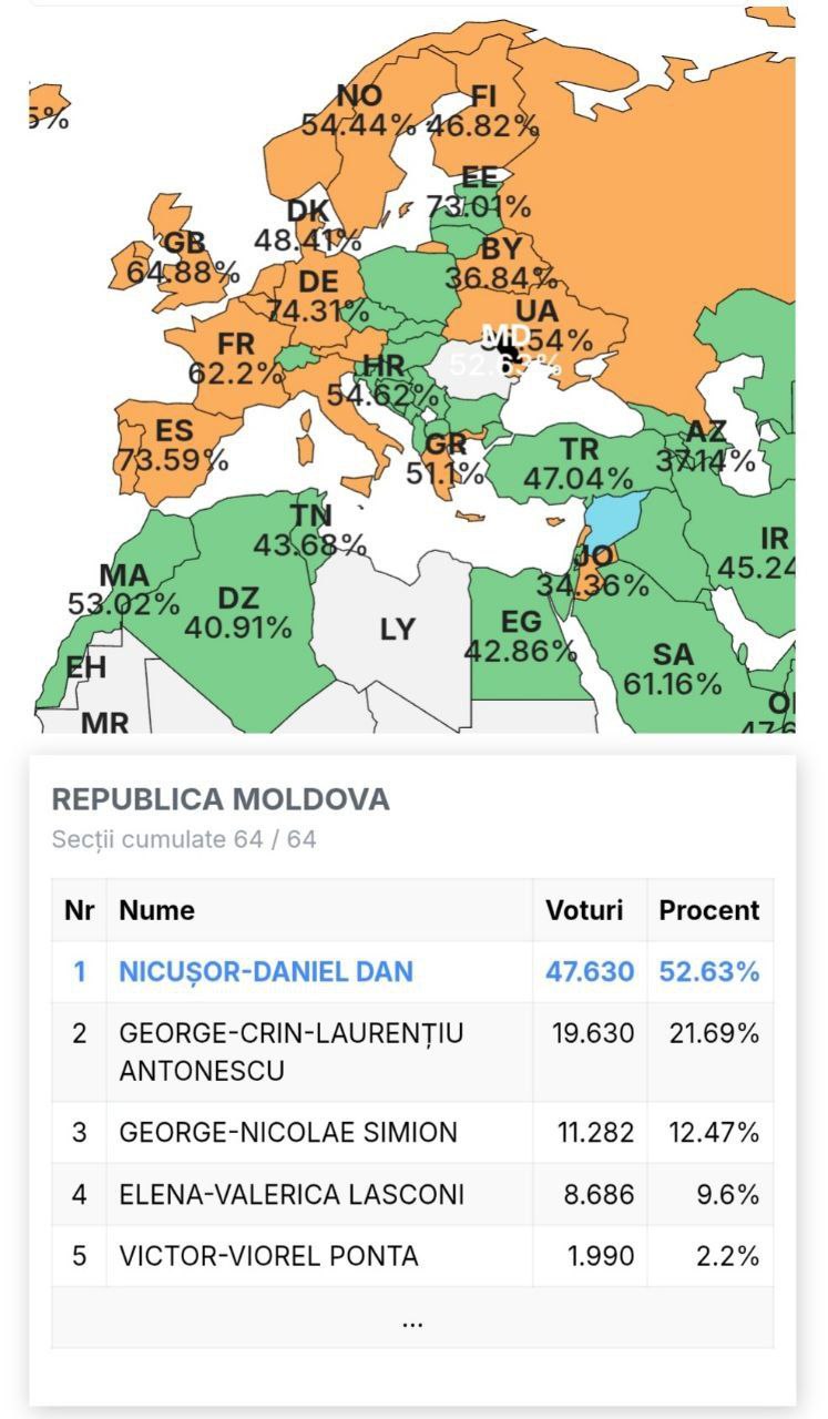 Astfel, în Republica Moldova, Nicușor Dan a obținut 52,6% din voturi. Pe locul doi, s-a clasat Crin Antonescu, cu 21,69% din voturi, respectiv 19.630. George Simion a obținut 12,4% din voturi – 11.282.