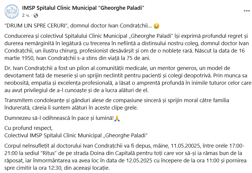 „Corpul neînsuflețit al doctorului Ivan Condrațchii va fi depus, mâine, 11.05.20025, între orele 17:00-21:00 la sediul „Ritus” de pe strada Doina din Capitală, pentru toți care vor să-și ia rămas bun de la răposat, iar înmormântarea va avea loc în data de 12.05.2025 cu începere de la ora 11:00 și pornirea spre cimitir la ora 12:30, din aceeași locație.