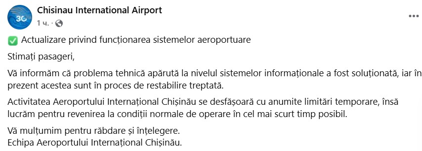 Responsabilii din cadrul Aeroportului Internaținal Chișinău au venit cu explicații pe haosul creat în această dimineață la aerogară. „Anumite sisteme informaționale ale Aeroportului Internațional Chișinău sunt temporar indisponibile din motive tehnice, iar unele servicii aeroportuare pot înregistra întârzieri sau funcționări limitate”, a comunicat instituția.