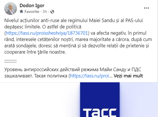 „Nivelul acțiunilor anti-ruse ale regimului Maiei Sandu și al PAS-ului depășește limitele. O astfel de politică va afecta negativ, în primul rând, interesele cetățenilor noștri, marea majoritate a cărora, după cum arată sondajele, doresc să mențină și să dezvolte relații de prietenie și cooperare între ţările noastre”, a comentat Igor Dodon.
