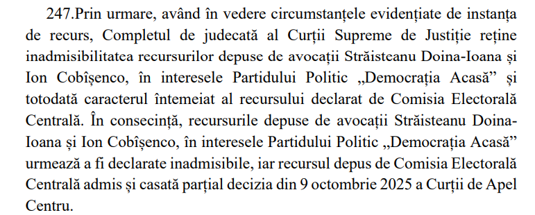 Astfel, magistrații Curții Supreme de Justiție au respins recursurile avocaților partidului, declarându-le inadmisibile, și au admis recursul Comisiei Electorale Centrale, menținând astfel decizia de a suspenda finanțarea publică a formațiunii pentru 12 luni.