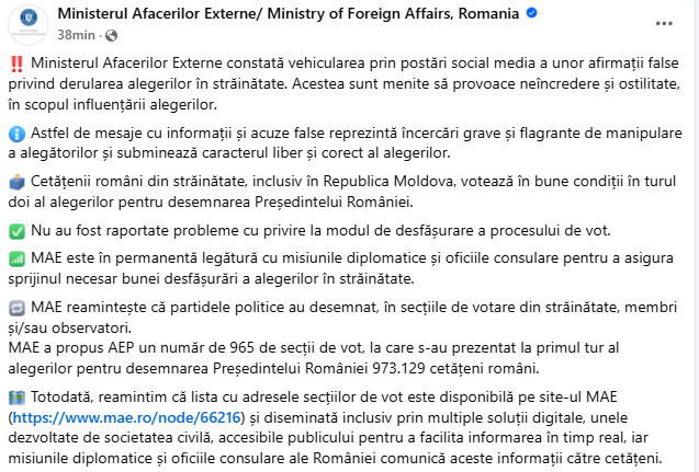„Ministerul Afacerilor Externe constată vehicularea prin postări social media a unor afirmații false privind derularea alegerilor în străinătate. Acestea sunt menite să provoace neîncredere și ostilitate, în scopul influențării alegerilor.