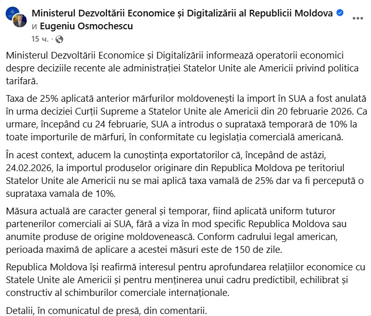 Potrivit autorităților, începând cu 24 februarie 2026, SUA aplică o suprataxă vamală temporară de 10% pentru toate importurile de mărfuri, inclusiv pentru produsele originare din Republica Moldova. Astfel, exportatorii moldoveni nu vor mai achita taxa de 25%, însă vor fi supuși noii suprataxe generale de 10%.
