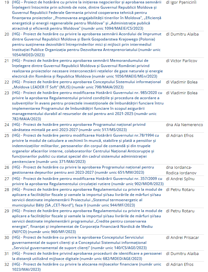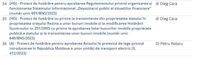 11:07 Oleg Cara a prezentat proiectul de hotărâre pentru aprobarea Programului de lucrări statistice pentru anul 2024, proiectul de hotărâre pentru aprobarea Regulamentului privind organizarea și funcționarea Sistemului informațional „Depozitarul public al situațiilor financiare” și proiectul de hotărâre cu privire la transmiterea din proprietatea statului în proprietatea orașului Rezina a unor bunuri imobile și la modificarea Hotărârii Guvernului nr.351/2005 cu privire la aprobarea listei bunurilor imobile proprietate publică a statului și la transmiterea unor bunuri imobile. Toate proiectele propuse au fost arpobate de miniștri.