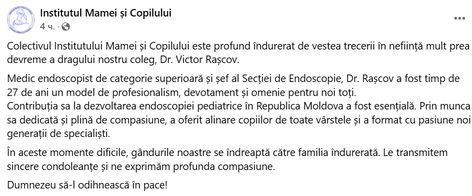 „Colectivul Institutului Mamei și Copilului este profund îndurerat de vestea trecerii în neființă mult prea devreme a dragului nostru coleg, Dr. Victor Rașcov.