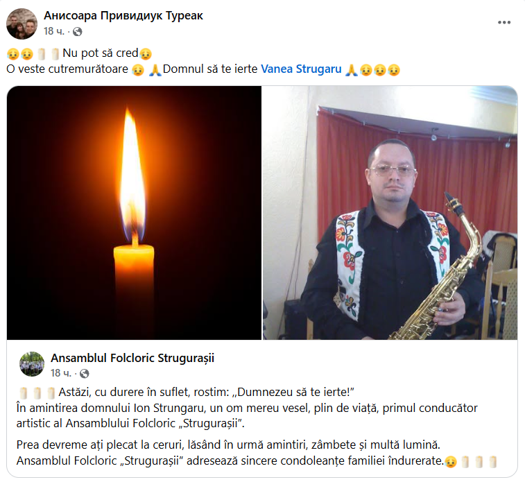 „Regretăm profund pierderea prematură a talentatului nostru coleg, violonist al Orchestrei de Muzică Populară „Barbu Lăutaru” — Ion Strugaru.